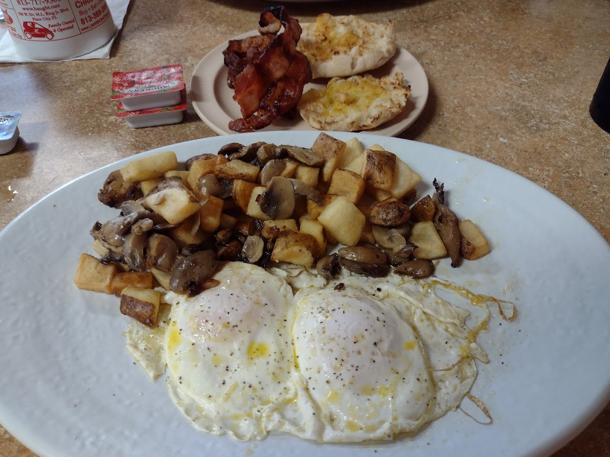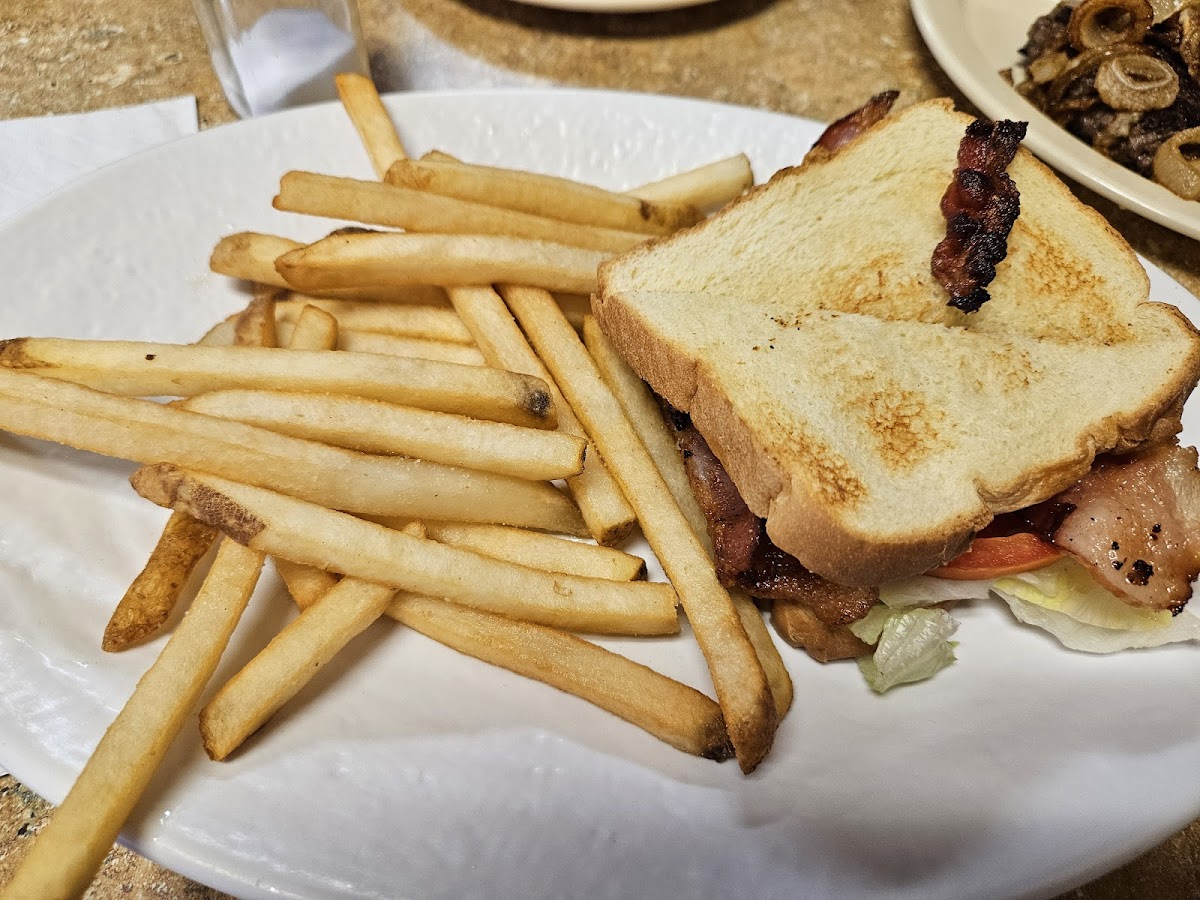 Food was good. Service was fast and friendly. The server (Lady with tattoos and Snoopy shirt) is certainly an asset to this restaurant. She was upbeat and personable. Attentive without hovering and knew what I needed before I asked. She greeted everyone as they came in and wished them well as they left. It was refreshing to be around someone who was working and not complaining or acting as if they hated their job and hated me for making them work. The food was very good. I had the BLT and fries, today’s dining companion had a veggie omelette, grits and English muffin. Everything was cooked as ordered and tasty.